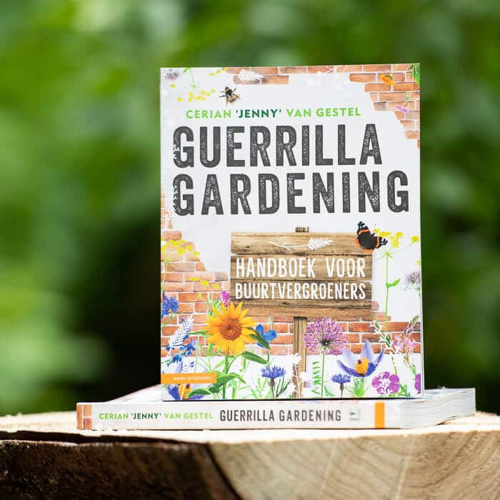 Het handboek Guerrilla Gardening is geschreven door Cerian ‘Jenny’ van Gestel, van de Guerrilla Gardeners. Het boek dient als leidraad om jouw directe omgeving groener te kunnen maken. Je vindt hierin praktische tips over hoe je de biodiversiteit een boost kunt geven – dus hoe je met groen de bijen, vlinders en vogels weer terug naar de stad laat komen – en hoe je van kleine tot grote schaal groen kunt toevoegen.
