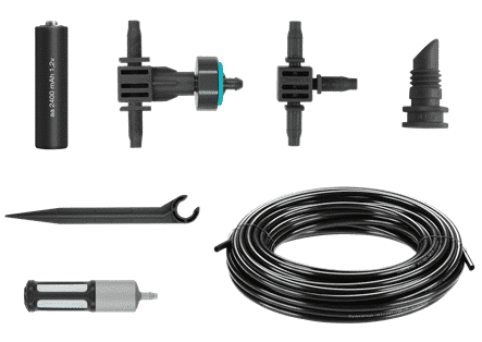 De Gardena AquaBloom wordt gebruiksklaar geleverd met daarbij slangen en druppelaars om tot 20 planten van water te voorzien. De AquaBloom zelf beschikt over een besproeiingscomputer met 14 verschillende bewateringsprogramma’s. De ingebouwde waterpomp zorgt vervolgens voor een juiste dosering vanuit het waterreservoir, ook als je op vakantie bent. Je kunt de slang gemakkelijk op de juiste maat knippen en zo zelf de afstanden tussen de druppelaars bepalen. Met de bijgeleverde spiezen kun je de slang goed vastzetten in de aarde. De T stukken maken het mogelijk om vertakkingen te maken en zorgen ervoor dat je de kabel makkelijk door kunt leggen.