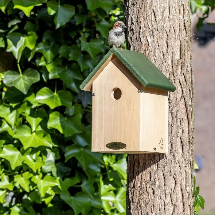 Met de nestkast mus & boomklever (Oklahoma) kun je de meest voorkomende tuinvogels verwachten. De invliegopening van 34mm is geschikt voor onder andere de huismus, boomklever en koolmees.