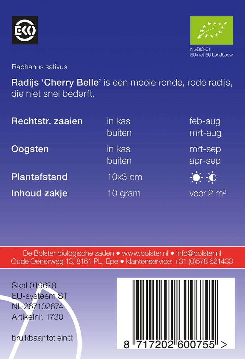 De ronde radijs ‘Cherry Belle’ kan vanaf februari in de kas of maart in de vollegrond gezaaid worden. Deze radijs bederft niet snel. Bedek de radijs met insectengaas om aantasting te voorkomen. Eén zakje is voor circa 2 m2, en de plantafstand bedraagt 10×3 cm.