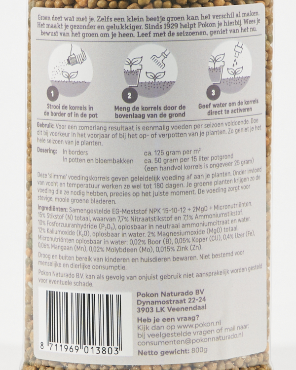 Deze voedingskorrels van Pokon zijn ideaal voor planten in pot of in border. Het zorgt voor stevige en mooie groene bladeren. Eenmalig voeden is voldoende voor één heel seizoen.